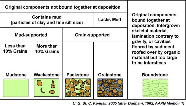 Criterio utilizado: porcentajes relativos de granos y de barro (presencia o no de micrita) y su disposición (relación entre granos y matriz). El carácter de soporte por granos entre sí o soporte por barro es, en algunos casos difícil de determinar. Se puede utilizar como criterio de soporte de granos los porcentajes de granos superiores al 60%. La clasificación de Dunham no hace referencia al tamaño de los granos ni al tipo de estos; se suele hacer, sin embargo, mención de ello. Ejem: grainstone oolítico, o packstone de crinoides.