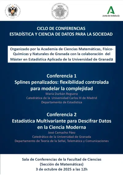 Organizado por la Academia de Ciencias Matemáticas, Físico-Químicas y Naturales de Granada; con la colaboración del Máster en Estadística Aplicada de la Universidad de Granada, el día 3 de octubre de 2025 a las 12:00 en la Sala de Conferencias (Sección de Matemáticas) de la Facultad de Ciencias de la Universidad de Granada tendrá lugar el Ciclo de Conferencias Estadística y Ciencia de Datos para la Sociedad .