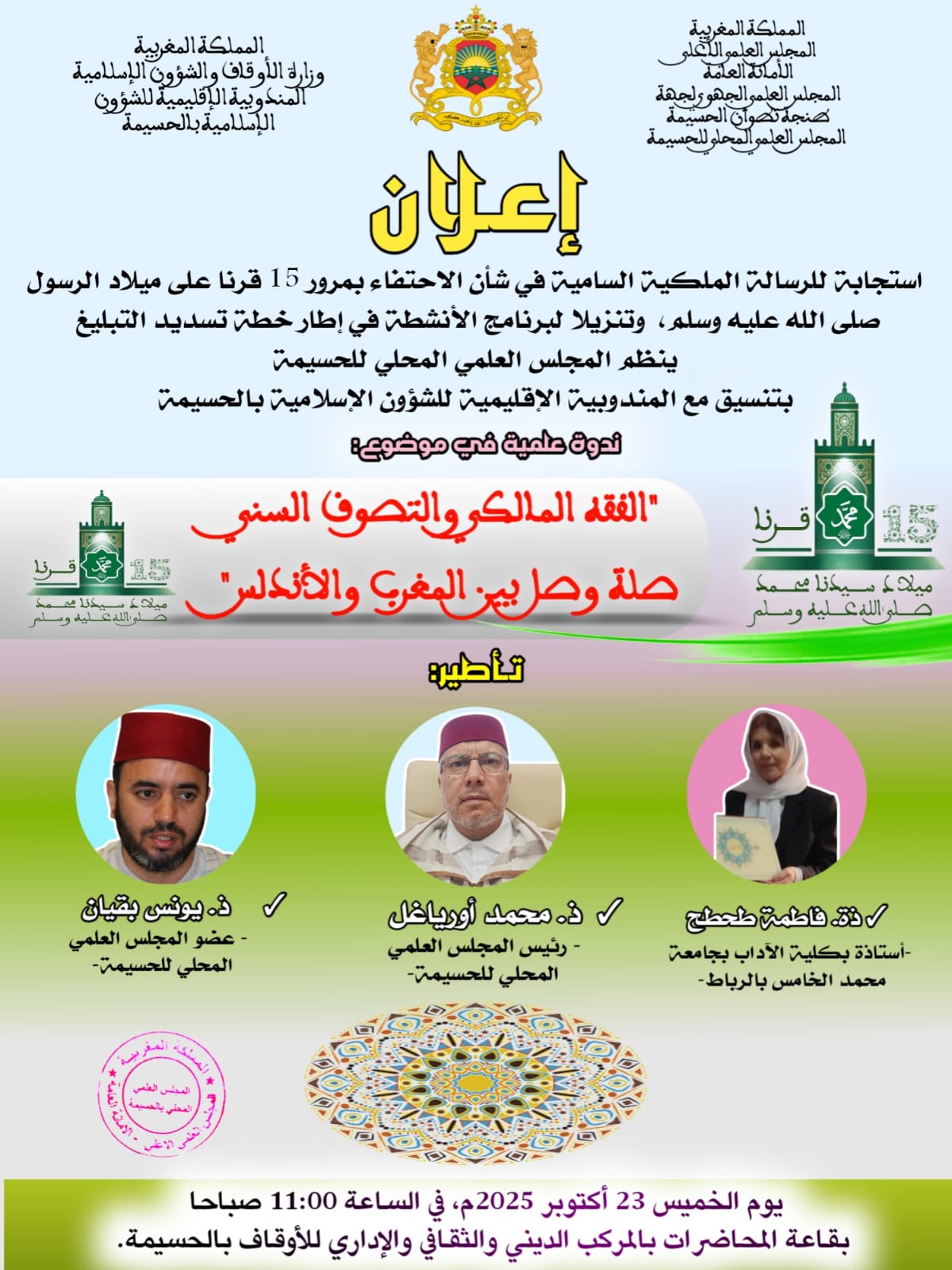 3 de julio de 2025El pasado jueves, día 23 de octubre de 2025, nuestra compañera la Dra. Fatima Tahtah ha participado en el Seminario Científico titulado Al-Fiqh al-mālikī wa-l-Taṣawwuf al-sunnī: ṣila waṣl bayn al-Magrib wa-l-Andalus (Jurisprudencia mālikī y sufismo suní: un vínculo entre el Magreb y al-Andalus), organizado por el Consejo Científico Local de Alhucemas en coordinación con la Delegación Regional para Asuntos Islámicos de la misma ciudad.