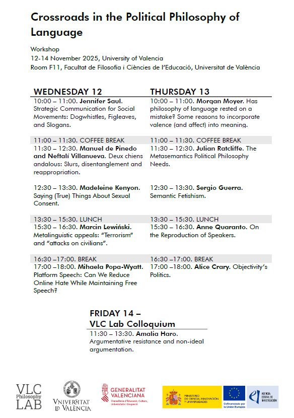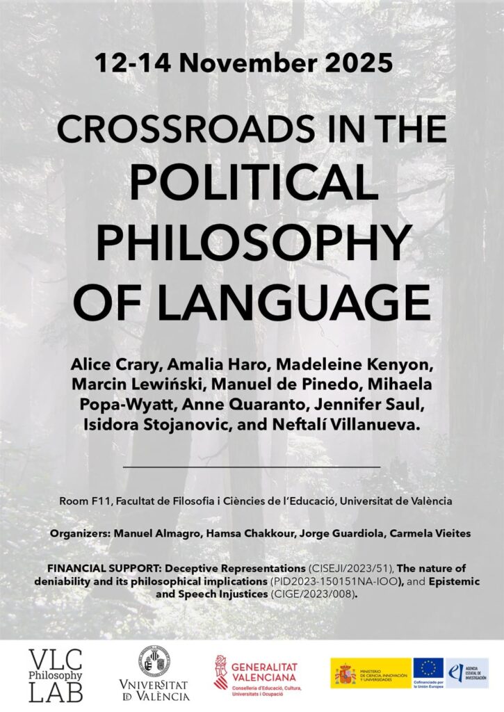 El próximo 3 de septiembre finaliza el plazo de presentación de resúmenes para el workshop «Crossroads in the Political Philosophy of Language», que se celebrará los días 12 y 13 de noviembre de 2025 en la Facultad de Filosofía y Ciencias de la Educación de la Universitat de València. Nuestro compañero Manu Almagro Holgado, colaborador de FiloLab, forma parte del comité organizador.