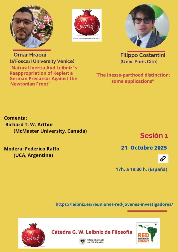 La sesión correrá a cargo de dos ponentes: Omar Hraoui (Ca’ Foscari University Venice), que hablará de «Honoré Fabri and Leibniz’s Works on Elasticity from the 1680s»; y Filippo Costantini (Université Paris Cité), que hablará sobre «The Inesse-parthood distinction: some applications». Comentará ambas ponencias Richard T.W. Arthur y moderará Federico Raffo. Se puede acceder online a la sesión a través de este enlace.