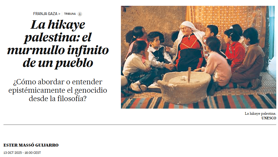 El pasado 13 de octubre de 2025, nuestra compañera Ester Massó Guijarro, investigadora de FiloLab, publicó en el diario El País el artículo titulado «La hikaye palestina, el murmullo infinito de un pueblo», dentro de la sección Planeta Futuro.