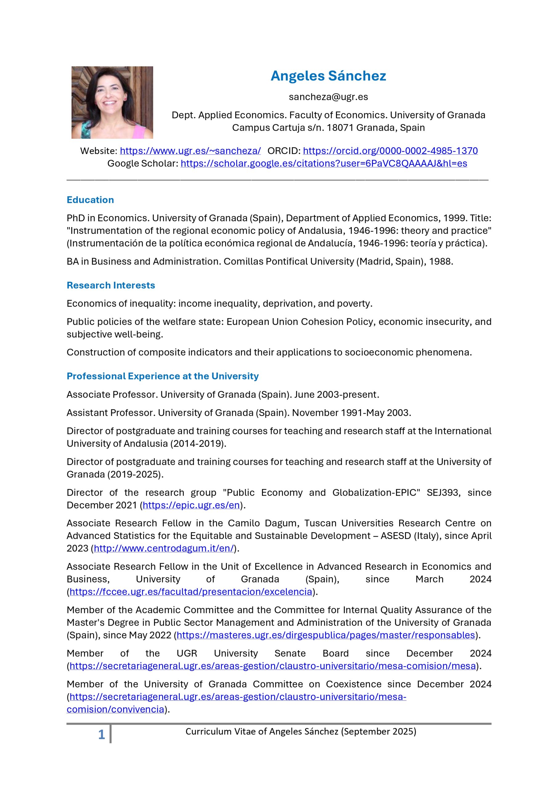 Angeles Sánchez is an associate professor in the Department of Applied Economics at the University of Granada (Spain). She teaches undergraduate courses at the Faculty of Economics and Business Administration, Master’s and PhD courses. Angeles’ research is focused on the economics of inequality and public policies of the welfare state. The output from this work has been published in a range of leading international peer-reviewed journals.